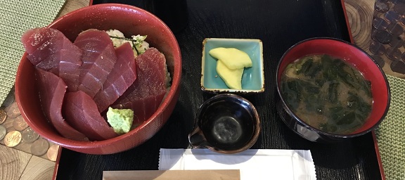 南三陸ハマーレ歌津・歌津がねの『マグロ丼』は、マグロでご飯が見えません。ワサビ醤油で頂きました。