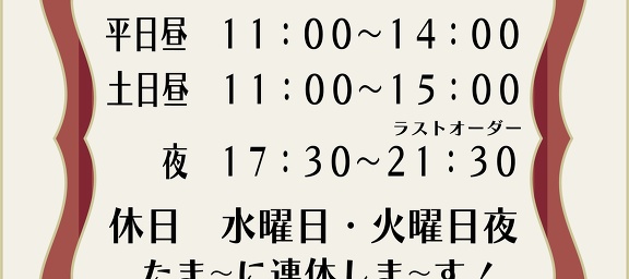 以前との変更点は、週末(土日)は、昼の部11時〜15時、夜の部17時30分〜21時30分(ラストオーダー)になります。ラストオーダー後は注文は出来ませんがゆっくりお食事を楽しんでください。